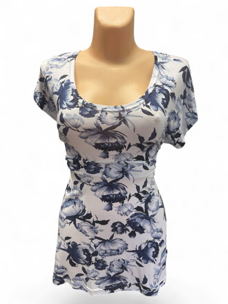 Halenka s přestřihem pod prsy se spadlým rukávem a délce až 82 cm, viskozový úplet.